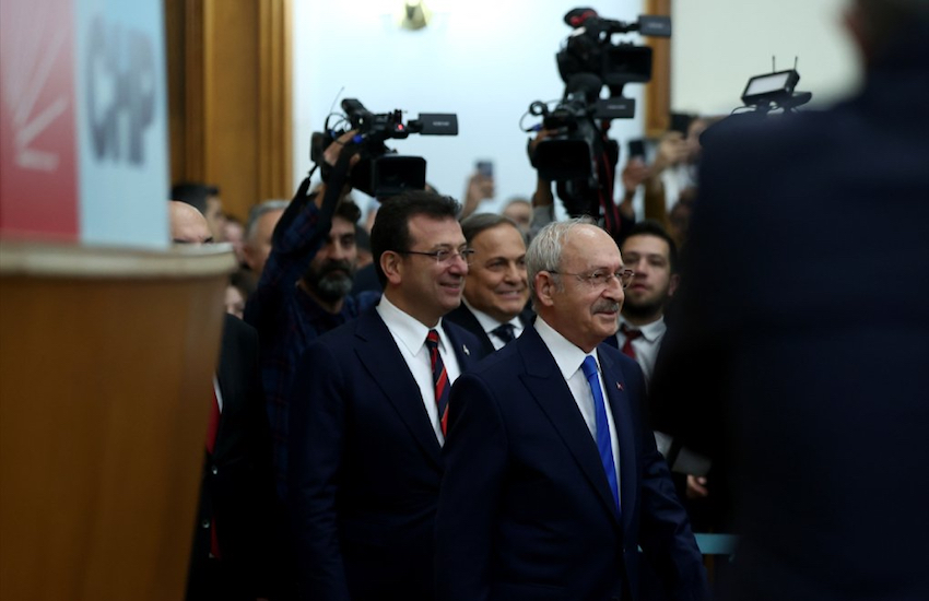İkili grup toplantısından önce Kılıçdaroğlu’nun makam odasında görüştü. Daha sonra da grup toplantısına geçti. Kılıçdaroğlu ve İmamoğlu’nun salona girişi esnasında CHP’liler ‘El ele kol kola omuz omuza’ sloganı attı. Kılıçdaroğlu kürsüye ‘İktidar’ sloganıyla çıktı.